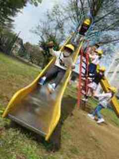 探検で確認した滑り台は、みんなのお気に入りです。休み時間には、黄色い帽子をかぶって遊んでいます。