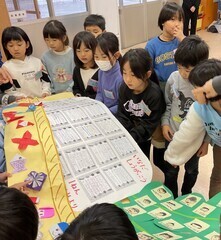 大根のお礼に1組と2組それぞれで稲田保育園に行きました。 1組は、一人一人書いた手紙を一つにした本と、折り紙を作って渡しました。2組は、画用紙で作った大きな大根に一人一人の手紙と似顔絵を貼って渡しました。どちらも大変喜んでくれました。