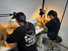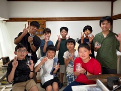 【江戸切子体験】今までのはしゃぎようから一変して、真剣な表情な子どもたち。江戸切子体験をしています。コップの側面は星の模様を中心に、底は自分で選んだ模様を専用の機械で彫ります。納得の出来栄えのようです!