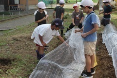 秋野菜には防虫ネットが必要だということが分かったので、畑にネットを張ることにしました。これも、みんなで協力しながら作業を進めました。 おいしい秋野菜ができるのを、今から心待ちにしています。
