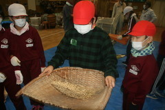子どもたちは、脱穀した籾を「もみかご」を使って空籾や入ってしまった藁を分別する作業を体験しました。