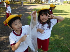 公園には、たくさんのトンボが飛んでいて、ついたとたん「すご~い。」と歓声があがりました。「どんぐりがたくさん落ちている。」とどんぐりを拾ったり、伸ばした指にトンボが止まる様子に喜んだりと楽しそうに秋探しをしました。
